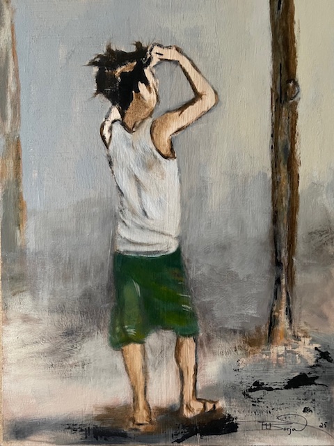 The Kid with the Ball-Eitempera auf Philippinische Plywood-Hochformat : 40.5 x 55 cm – 2025