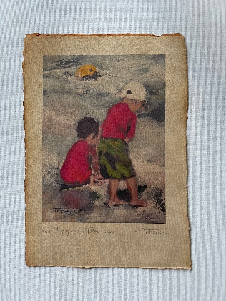 Kids Playing on the Beach, 2024- Ausdruck auf Vintage Papier, A4